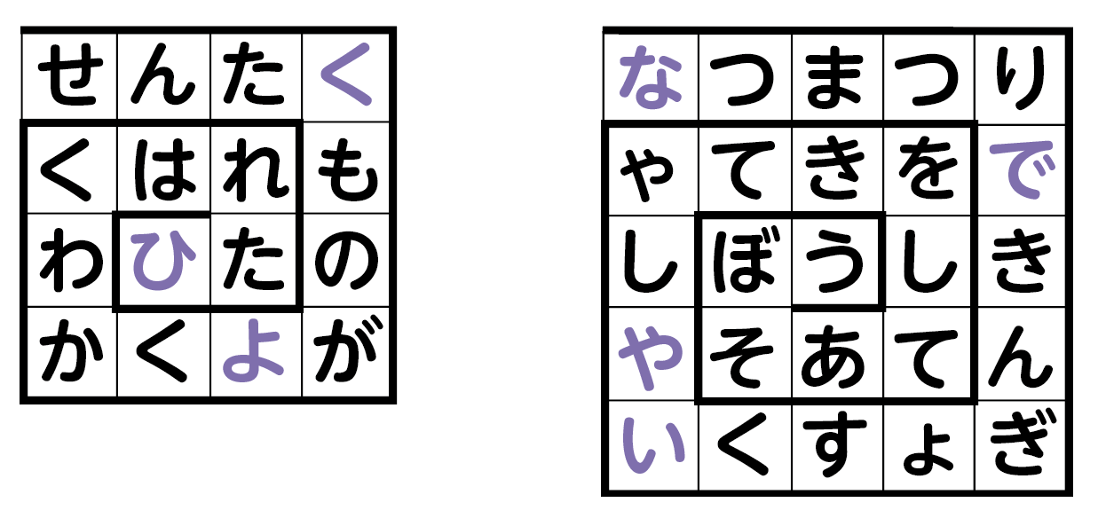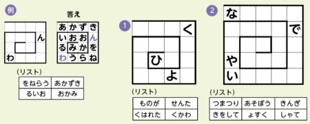 文章がつながるように、盤面の左上からぐるぐると中心に向かってリストの文字列を入れていくパズルです。盤面の途中の文字がヒントです。例題を参考に挑戦してください。
