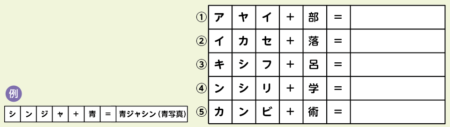 ①アイ部ヤ(相部屋) ②落カセイ(落花生) ③フ呂シキ(風呂敷) ④シンリ学(心理学) ⑤ビ術カン(美術館)