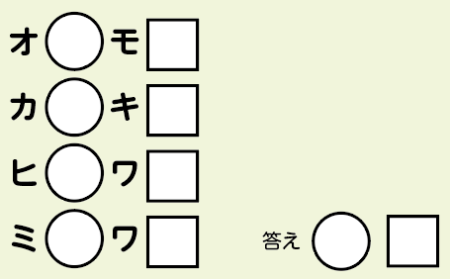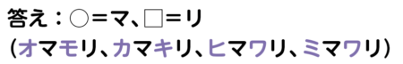 ○は全て同じ文字、□にも全て同じ文字が入ります。入る文字を答えてください。