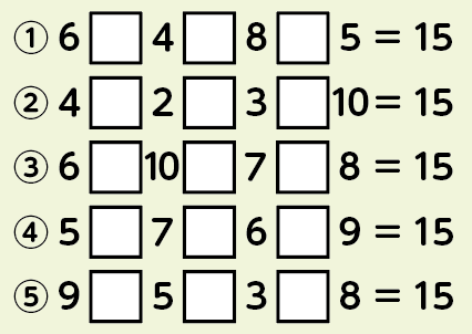 いずれも結果が15になる式です。□には+かーのどちらかが入ります。式を成立させてください。