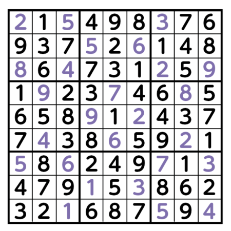 同じ列や同じブロックに同じ数字がだぶって入らないように、マスを埋めてください。