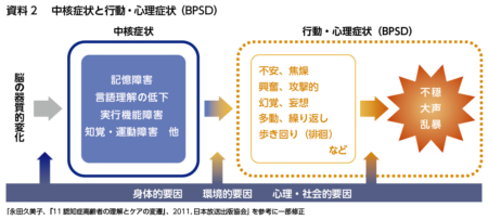 認知症には記憶障害、言語理解の低下、各種の行動障害などの中核症状があります。痛みなどの身体要因、環境要因、周囲の対応などによって引き起こされる二次的な症状が行動・心理症状(BPSD)です(7ページ資料2)。興奮や徘徊などが代表的な症状で、抗不安薬や抗うつ薬などの薬物治療も行われますが、なにより、原因となっている要因の改善が大事です。