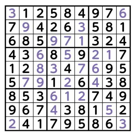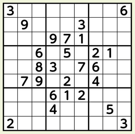 同じ列や同じブロックに同じ数字がだぶって入らないように、マスを埋めてください。
