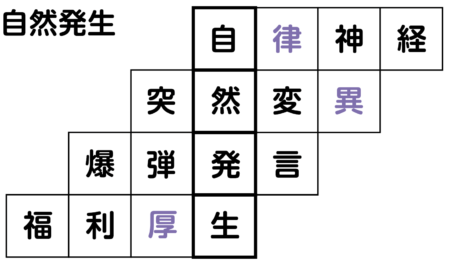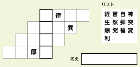 リストの漢字を□に入れて、横方向に4つの四字熟語ができるようにしてください。リストの漢字は一度しか使えません。すでに入っている漢字がヒントです。最後に太枠に入った漢字を上から順に並べてできる言葉を答えてください。