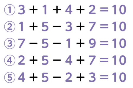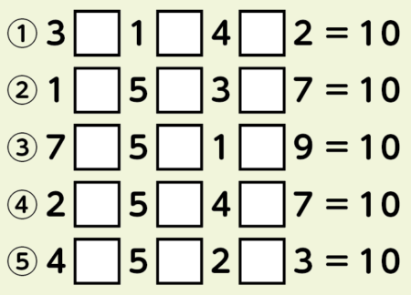 いずれも結果が10になる式です。□には+かーのどちらかが入ります。式を成立させてください。