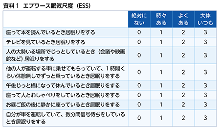 日中の眠気の程度は、エプワース眠気尺度(ESS)(資料1)で自己評価できます。点数が11点以上の場合、病的な眠気がある可能性が考えられます。ただし、多忙や慢性的な睡眠不足により、眠気を自覚しないケースもあるため注意が必要です。