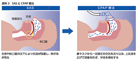 中等症から重症の治療において第1選択とされます。鼻マスクを介して一定陽圧の空気を送り込み、睡眠中の気道の閉塞を防ぎます(資料3)。CPAP療法により、AHIが劇的に改善し、低酸素状態が解消されることが確認されています。
