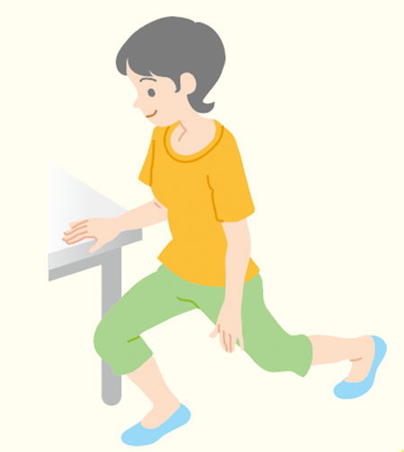 ❶ テーブルなどに軽く手を添えて体を支え、脚を前後に開く
