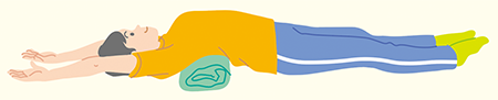 ❶ 仰向けになり、3~4つ折りにしたバスタオルを背中側のみぞおちの位置に入れる