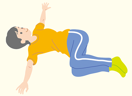 ❶ 仰向けに寝て両膝を立て、両腕を肩の高さに広げる。息を吐きながら両膝をゆっくりと片側に倒し、10秒〜20秒ほどキープ