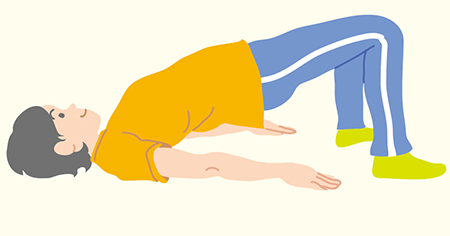 ❶ 仰向けで両膝を立て、両腕を体の横、手のひらは下向きにする。お尻から持ち上げ、次に背中を持ち上げる