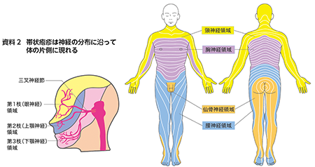 顔または体の片側の神経支配領域に沿って、帯状に痛みを伴う水ぶくれが出現します(資料1)。ピリピリとしたかゆみや痛みが数日続き、その後水ぶくれを伴う発疹が出現。3~5日かけて水ぶくれが増えていき、10~15日かけてかさぶたになって治ります。皮膚病変が正常化するまでには1カ月程度かかります。
