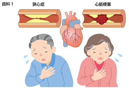 心筋梗塞は、冠動脈が血の塊(血栓)やコレステロールなどによって突然詰まってしまう病気です(資料1)。血液が流れなくなった部分の心筋が傷み、心臓の機能が低下することで、心不全や不整脈を合併し命に関わる状態となります。