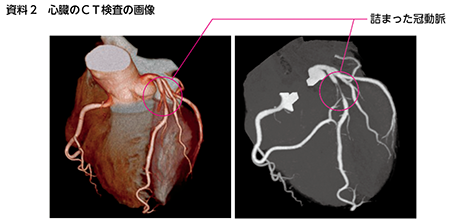 また、造影剤を使用した心臓CT検査(資料2)は外来で行うことができ、冠動脈の評価に非常に有用です。これらの検査で疑わしい場合は冠動脈の状態を詳しく調べるため、心臓カテーテル検査を行います。これにより、血管の狭さや詰まりの程度を正確に把握することができます。