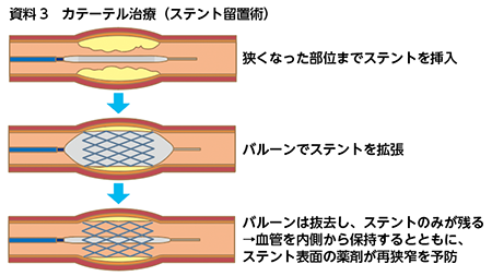 冠動脈の治療は主に2種類あります。一つ目はカテーテル治療です。カテーテル治療は手首や足の付け根の動脈から心臓まで直接カテーテルを挿入し、狭くなった血管を風船で拡げたり、ステントと呼ばれる金属の金網を血管内に留置する手術です(資料3)。
