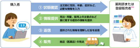 購入者は薬の注文時に必要な情報を入力し、薬剤師や登録販売者から薬に関する情報提供を受けます。不明な点や相談などがあればやりとりをして、購入者が了解できたところで薬が発送されます。