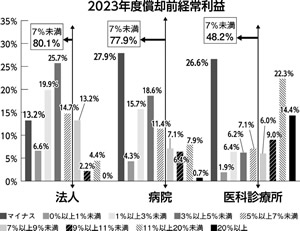 2023年度決算(140医科法人合計)は、償却前経常利益(※)で予算比66・2%(コロナ補助金を除くと33・8%)と大幅な未達成となりました。