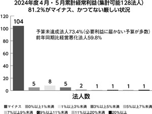 同利益予算未達成の法人は、66・2%(88法人)、償却前経常利益がマイナスとなり、大幅な資金流出構造に陥っている法人が13・2%(18法人)です。償却前経常利益率3%未満が39・7%(54法人)となるなど、全体として資金流出構造が継続しており、想定された以上の厳しい結果です。すべての事業で利益の大幅悪化がみられ、事業活動の見直し、再編、戦略の立て直しが求められています。