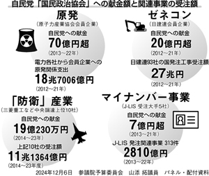 石破政権は2024年度補正予算において能登半島の復旧・復興予算の3倍にあたる、8268億円の防衛費を充てました。自民党は経団連加盟企業から24億円もの企業団体献金を受け取り、それが防衛費増、経済優先の政策実現というゆがみをもたらし(図1)、平和、人権、いのちとくらしに背を向けています。