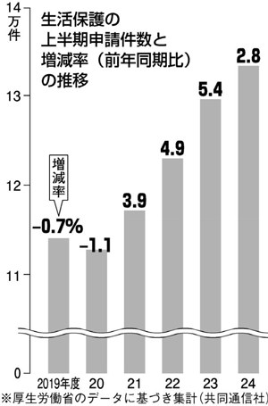 24年度上半期の生活保護の申請件数は前年同期比で2・8%増にのぼっています。新型コロナウイルス感染拡大で景気が悪化した期間や、コロナ禍に伴う生活支援の縮小が低所得者層を直撃した時期の申請件数を実数で上回り、コロナ禍前の2019年同期と比べ16・8%の増加です(図2)。