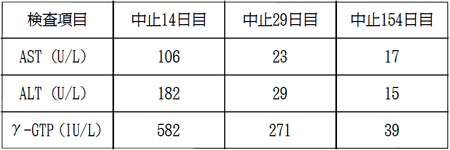 中止14日目:体調改善せず受診、血液検査で肝障害を認めた