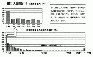 第二は、入院早期に多発していました。特に入院当日に集中しています(図1)。この傾向は一般病棟ではさらに顕著です。入院という環境の変化に適応できないことが原因と考えられ、入院(転室・転棟)時点で即、対策を取ることが重要です。