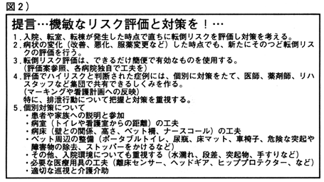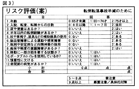 【提言】これらの結果から、機敏なリスク評価シートと対策が求められます。転倒・転落チームでは、以下の提言をまとめました(図2)。またリスク評価(案)を検討しました(図3)。 今回の調査対象の患者にこの評価(案)を当てはめると、5点以上になる人が八九%でした。5点以上をハイリスクの患者と考えて対応することが求められま す。 今回の調査結果を参考に各事業所でできるようなものを作成し、転倒・転落防止対策に生かしていくことをよびかけます。