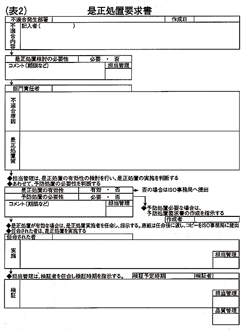 これをよく見てみると、一般のマニュアルとは違っています。このような手順書を、病院全体で100以上作成しました。各部では、必要に応じて朝会の時間に読み合わせ、手順通りに仕事が行われているかをチェックします。業務に適合していない項目があれば、是正要求書(表2)で報告されるしくみです。
