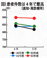昨年一〇月の高齢者一~二割負担と、四月の健保本人三割負担は、患者さんや医療機関にとって冷たい風でした。受診する患者は激減、医療を受ける権 利がおびやかされています。そんな中でも、高知の旭(あさひ)診療所はちがいます。昨年一〇月から患者件数を増やしており、四月も前年対比で一〇五%です (図)。「いまが出番、医療を受ける権利を守ろう」と、共同組織と協力し地域を歩き、積極的に医療相談や健診受診をすすめている結果です。(木下直子記者)