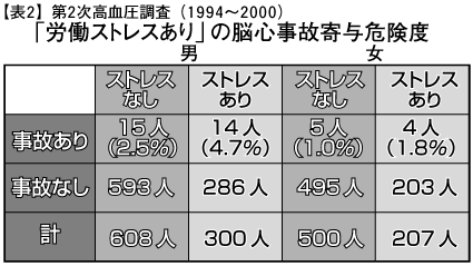 追跡期間中、初回脳心事故は男性29人、女性9人の計38人が発症し(表2)、うち6人が死亡しました。「労働ストレスあり」の人たちは、そうでない人 たちと比べて2.1倍、脳心事故発症を発症していました(表3)。一方、長時間労働の男性は、1.48倍倒れやすい状況にありましたが、統計的に有意では ありませんでした。