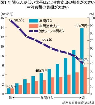 図1は、年間収入にしめる消費支出の割合です。所得の低い世帯では、収入がそっくり消費にまわっています。それに対して高所得者層では、収入の四〇%しか消費にまわりません。