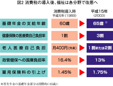 杵渕さんは話します。「消費税のおかげで老後を安心して暮らしているという人、誰かいますか? 消費税が導入された後も医療や年金など社会保障は次つぎと悪くなるばかり(図2)。話が違う、と多くの国民は怒ってますよ」。