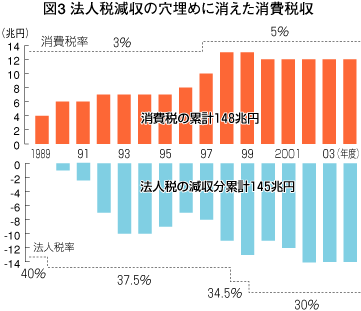 消費税が導入された一九八九年から二〇〇四年までの間に、私たち国民が払った消費税は一四八兆円にもなります(図3)。ところが、同時期、企業が払った法人税(地方税含む)は一四五兆円も減りました。なんと消費税は、大企業などの減税の穴埋めにされました。