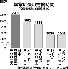 今回の「改正」案のもう一つの重大な問題は、「時短促進法」の事実上の廃止です。日本の労働者の年間平均労働時間は二二〇〇時間、しかも急増するパートなど短時間労働者を含む平均値です(図2)。