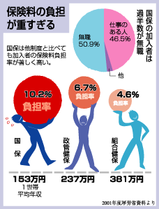 国保に加入する人は自営業者か高齢者ですが、高齢化と不況による失業者の増加で、無職者の割合が五割を超えています。