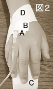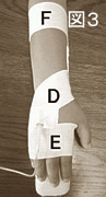 図3のようにD、E、Fの三点でシーネを固定し、関節の動きを抑制します。患者さんがテーブルやベッドの上で手をつくと、Fが伸びてしまうことがよくあります。手関節が動くことにより留置針がずれ、血管炎が起こりやすいため、テープを適宜貼りかえます。