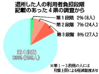 この調査は八府県が自ら実施したもの。収集した保団連の金指栄一さんは、次のように分析します。「利用料負担の第四段階とは市町村民税が世帯で課税の 人。その中に、高齢者本人は非課税の世帯も含まれるが、負担額の軽減措置がないため、その世帯から退所が出ていると推定できる。これは保団連の別の調査で も裏付けられる」。