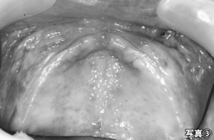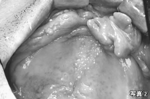 六〇代の男性。上下無歯顎。上顎義歯が不安定で外れやすく、咀嚼障害がありました。上顎歯肉部には、これまでの不適合義歯により「ビラビラした歯ぐき (繊維腫)(写真2)」ができていました。この浮動性の歯肉が、義歯の安定性と顎堤(がくてい)への吸着力を阻害した原因でした。NSTでそのことを報告 し、歯科受診をすすめました。