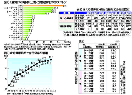 総務省の「労働力調査」によると、週六〇時間以上働き、月八〇時間以上残業をしている労働者は、約六二〇万人(男性五四〇万人、女性八〇万人)。月八〇 時間を超す時間外労働は、過労死しても不思議ではありません。過労死・過労自殺の労災申請と認定は年ごとに増え続けています(表1)。健診での異常も増え ています(図2)。