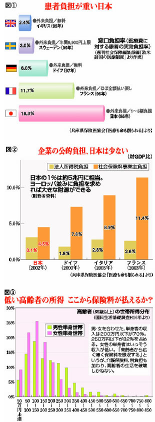 「高齢者に過酷な保険料を課し、『痛み』につぐ『痛み』を押しつける、際限のない負担増。高齢者の医療給付を削減し、差別医療になる危険性がある」(共産党)。「医療費の管理を他の世代と別枠で行うため医療格差が心配。全加入者から保険料を徴収、滞納すれば保険証が取りあげられる点も問題。現在、全国一律の保険料に格差が生じる」(社民党)。「平均寿命の男女差、75歳以上の男女比から見て合理的ではない。高齢者に一律に現役並の自己負担を求めるべきではない」(民主党)。野党は各党とも批判的です。 |