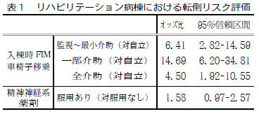 入棟時FIM車椅子移乗二~三点(一部介助)と評価された患者は、六~七点(自立)と判断された患者と比べ、一四・七倍も転倒しやすいという結果になり ました。同様に、四~五点(監視~最小介助)群の対自立群オッズ比は六・四倍でした。また、睡眠剤などの精神神経系薬剤服用患者は、服用がない患者と比べ 転倒リスクが一・六倍という結果でしたが、統計的には有意ではありませんでした。