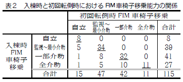 初回転倒時の移乗能力を示したのが表2です。入棟時FIM車椅子移乗一点(全介助)の患者は、二七人中一六人五九・三%が一部介助以上となってから最初の転倒を起こしています。