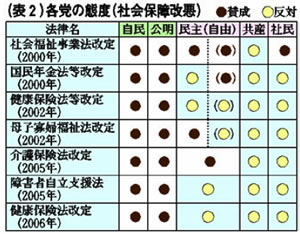 「貧困と格差」が深刻化した主要な二つの理由。一つは、派遣労働・裁量労働制・有期雇用制の拡大です。「労働法制規制の緩和」が次つぎ実施 され、低賃金・非正規雇用の労働者が増えました(表1)。二つめは、社会保障制度の連続改悪です(表2)。貧困の歯止めが失なわれています。これに各党は どんな立場をとってきたでしょうか。