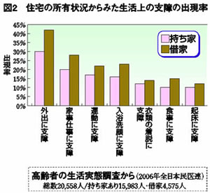 住宅の所有状況、つまり「持ち家」か「借家」かで、健康状態と生活上の支障を比較すると、明らかな差が出たのです。「借家」の人は、健康状態が悪く(図 1)、様ざまな面で、生活上の支障を抱えていました(図2)。また、要介護者の出現率も高くなっています。これは何を意味するのでしょうか。