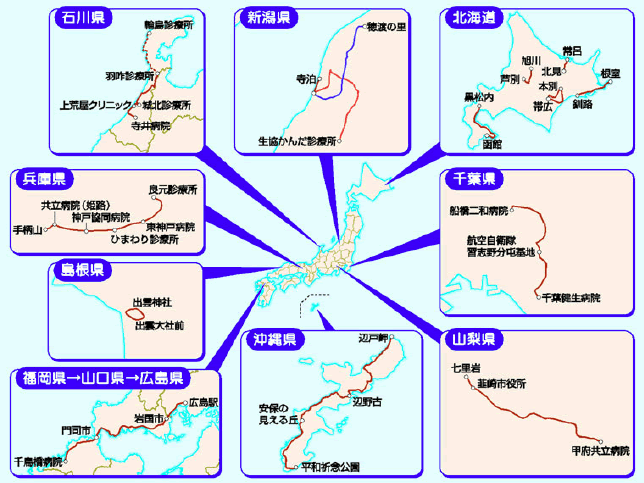 「憲法九条を守ろう」「平和を考えよう」と訴えて走るピースチャリンコ(平和自転車リレー)が広がっています。仲間づくりができ、アピール 効果もあり楽しい。応援団や歓迎会、学習など大勢の人でつくりあげる魅力もあります。編集部で把握した各県民医連のコースをマップにしました。