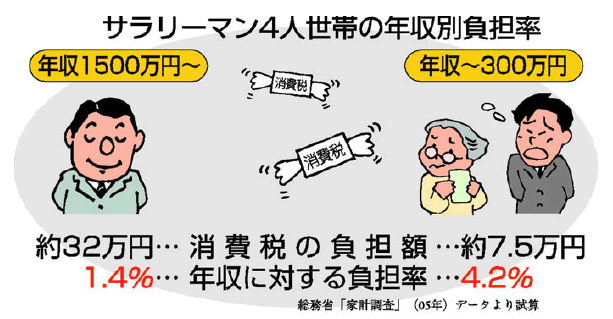 消費税の欠陥は、低所得の人ほど重い負担になる点です。月四万円の年金しかない人と、何千万円の収入がある人とでは重さが違います。実際に負担した〔消費税額÷所得〕でみれば、一目瞭然です。