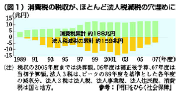 政府は消費税導入の際、「高齢化社会に備えるため」と宣伝しました。その一方で、経団連などの要求に応え、企業への減税をすすめました。消費税で増える はずの税収は、企業への減税で相殺されてきました(図1)。今度も「社会保障のために」といいますが、これも企業が担っている社会保障負担と置きかえるこ とが狙いです。