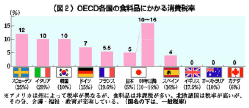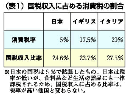 政府や与党は、「日本の消費税率は低い」といいます。しかし、それは偽りです。世界の主要国の消費税率は高いですが、生活必需品は非課税や低税率にするな ど、低所得者の負担を緩和する措置がとられています(図2)。しかも国税収入に占める消費税の比率が、すでに日本はイギリスやイタリアと変わりません(表 1)。日本では生活必需品も贅沢品も同じ税率なので、いっそう悪質です。