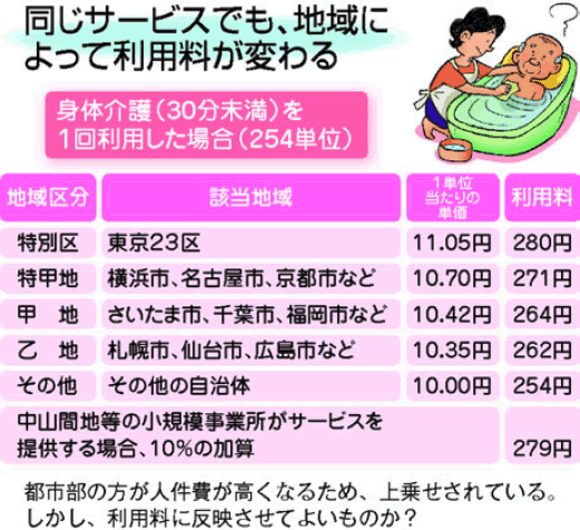 介護報酬の引き上げが利用の抑制につながらないようにすることも重要です。一つは、一割という重い利用料負担の軽減が必要です。とくに地域区分による報酬単価の上乗せなどは、利用者とは関係のないものです(図)。利用料に反映させないことが必要です。二つ目は、支給限度額を引き上げ、必要なサービスを保障すること。そして、介護保険料に対する公的補助を実施することです。