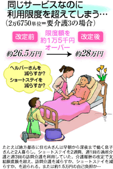 また支給限度額は変わらないので、報酬単価が上がると、保険で利用できる範囲がせばまることになります(図)。いままでと同じ利用内容を続けるには、限度額をオーバーした分を自費(一〇割負担)で利用することになり、その分が利用者の負担増になります。